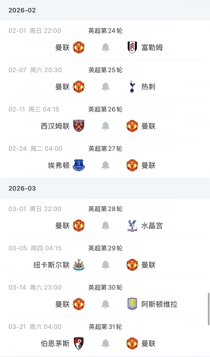 曼联未来赛程↓